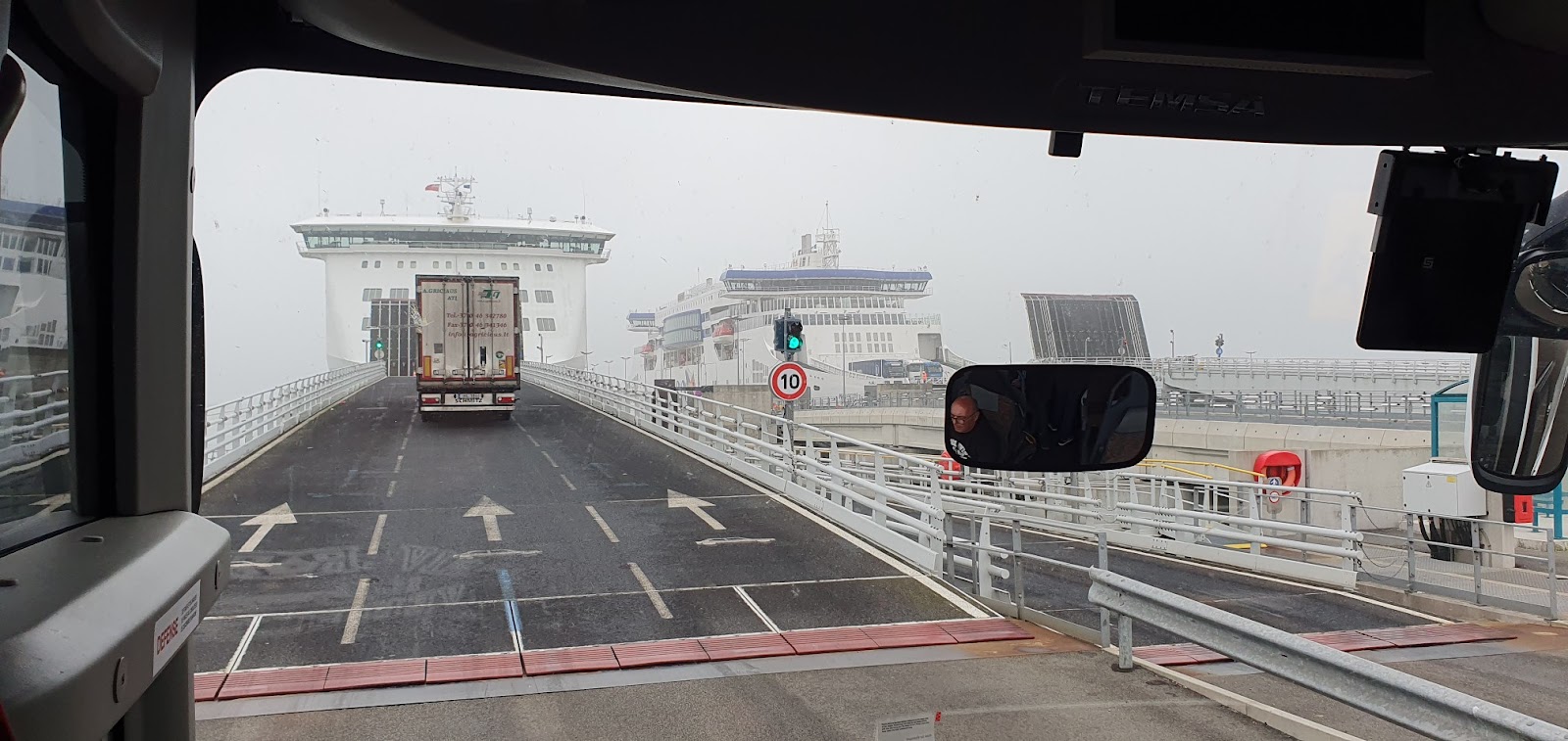 Une petite nuit, repos mais peu de sommeil. Le passage de la frontière avec le contrôle des documents prend beaucoup de temps, et le nombre impressionnant de cars et la complexité des formalités nous fait prendre du retard. Nous ne prendrons pas le ferry prévu à 9h, mais le suivant, à 11h20 après un passage de la frontière plutôt minutieux, grâce au zèle de certains officiers.